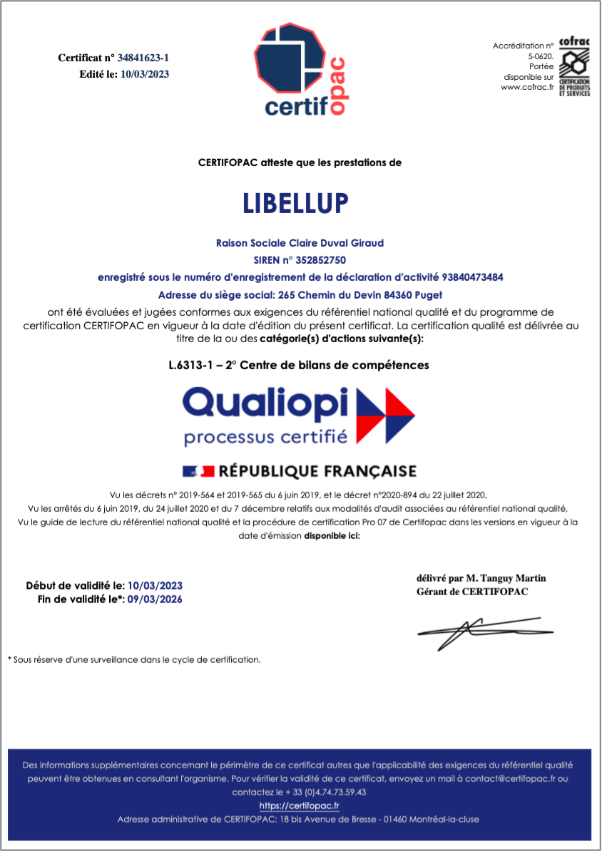 Le centre de bilan de compétences Claire Giraud – Libellup est un organisme de formation enregistré sous le numéro 93840473484 auprès du préfet de région Provence-Alpes-Côte d’Azur.